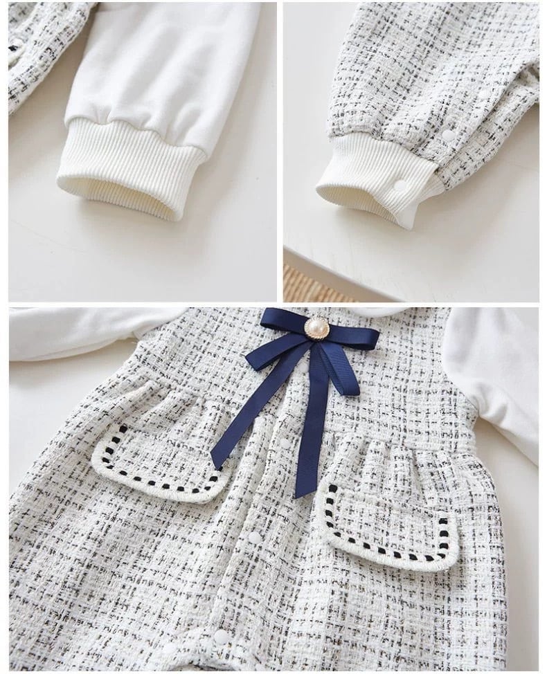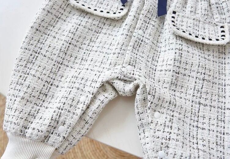 赤ちゃん向けのおしゃれなアイテムです。ツイード素材で作られており、上品でクラシカルな雰囲気を演出します。胸元には立体的なリボンが付いており、可愛らしさを引き立てます。ボタン付きのデザインで、着脱も簡単です。柔らかな素材が赤ちゃんの肌にやさしく、快適な着心地を提供します。日常のお出かけや特別なイベントにぴったりな、おしゃれなロンパースです。