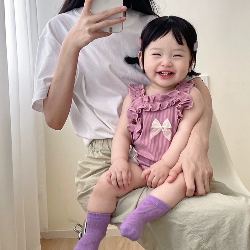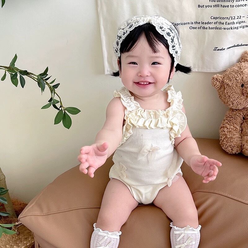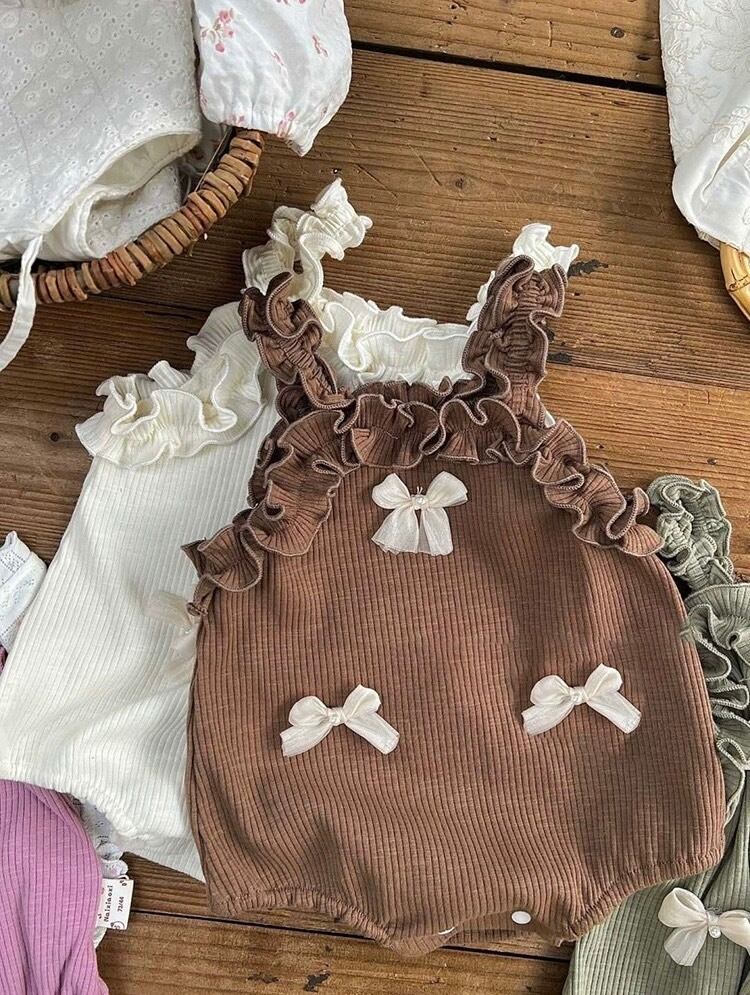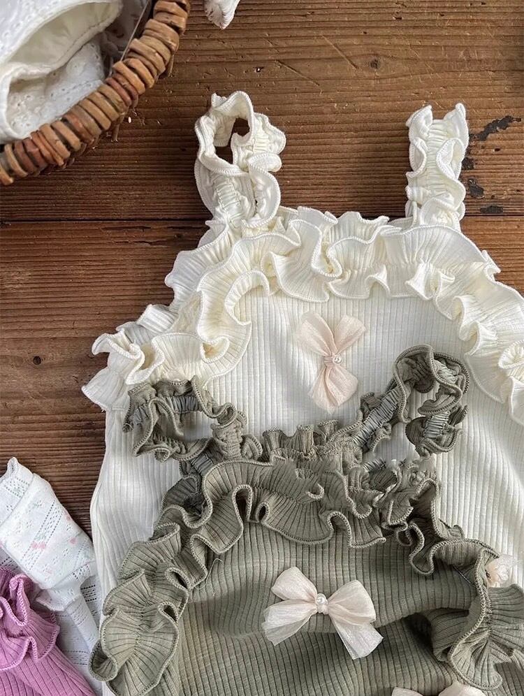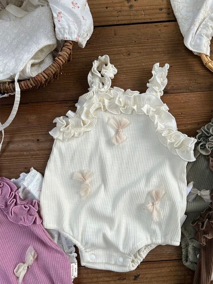 リボンとフリルが可愛らしいキャミソールロンパースです。軽やかな素材で、赤ちゃんの動きを妨げず快適に過ごせます。フリルのディテールがアクセントとなり、シンプルながらもおしゃれなデザインです。おむつ替えがしやすいスナップボタン付きで、実用性も兼ね備えています。暑い季節のお出かけや、特別な日のコーディネートにぴったりの一枚です。