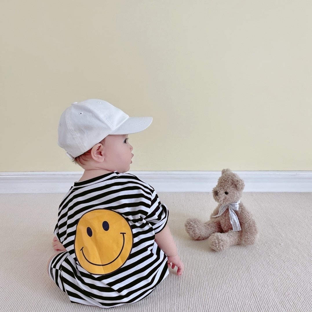 愛らしいスマイルのバックプリントが特徴のロンパースです。柔らかな素材でできており、赤ちゃんの敏感な肌に優しい着心地です。前面はシンプルなデザインで、背中に配置されたスマイルのプリントがアクセントとなっています。着脱が簡単なスナップボタン付きで、おむつ替えもストレスなし。普段着やお出かけ用に最適で、かわいらしいデザインで周囲の注目を集めること間違いありません。