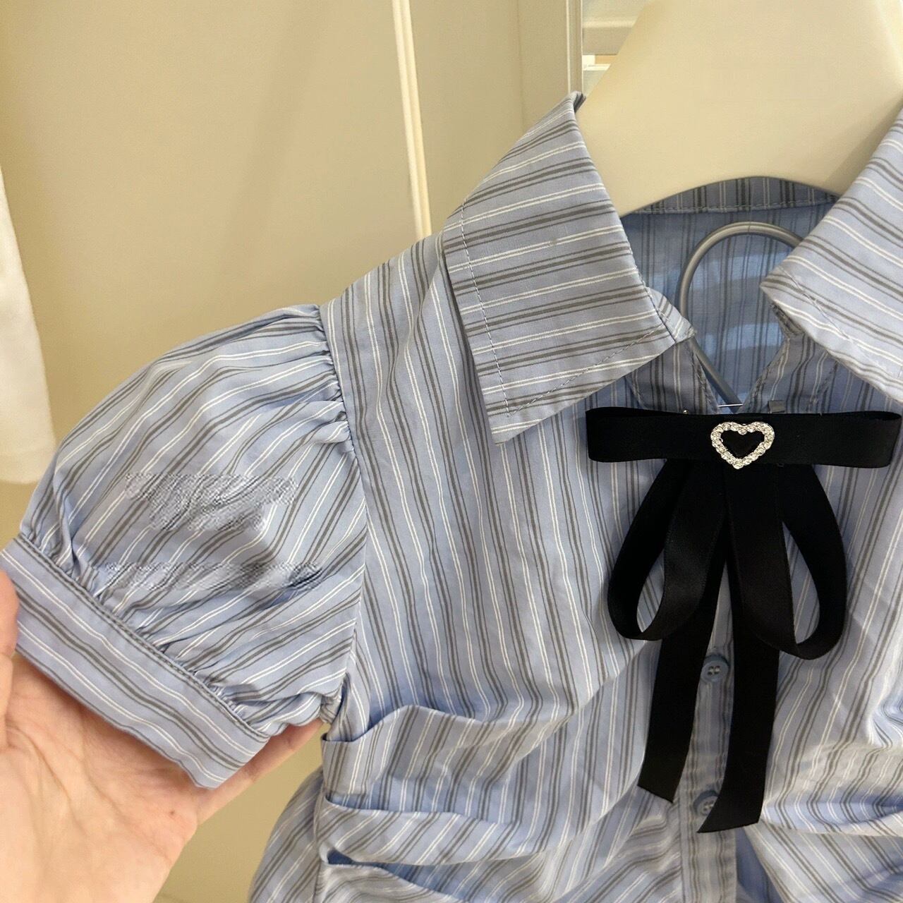 可愛らしいデザインが特徴のガーリーストライプリボンシャツワンピースです。爽やかなストライプ柄とパフスリーブがフェミニンな印象を与え、胸元のハート型リボンがポイントです。柔らかく快適な素材を使用しており、長時間の着用でも快適に過ごせます。デイリーカジュアルからお出かけまで、様々なシーンで活躍するアイテムです。