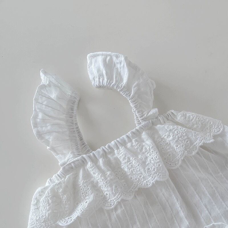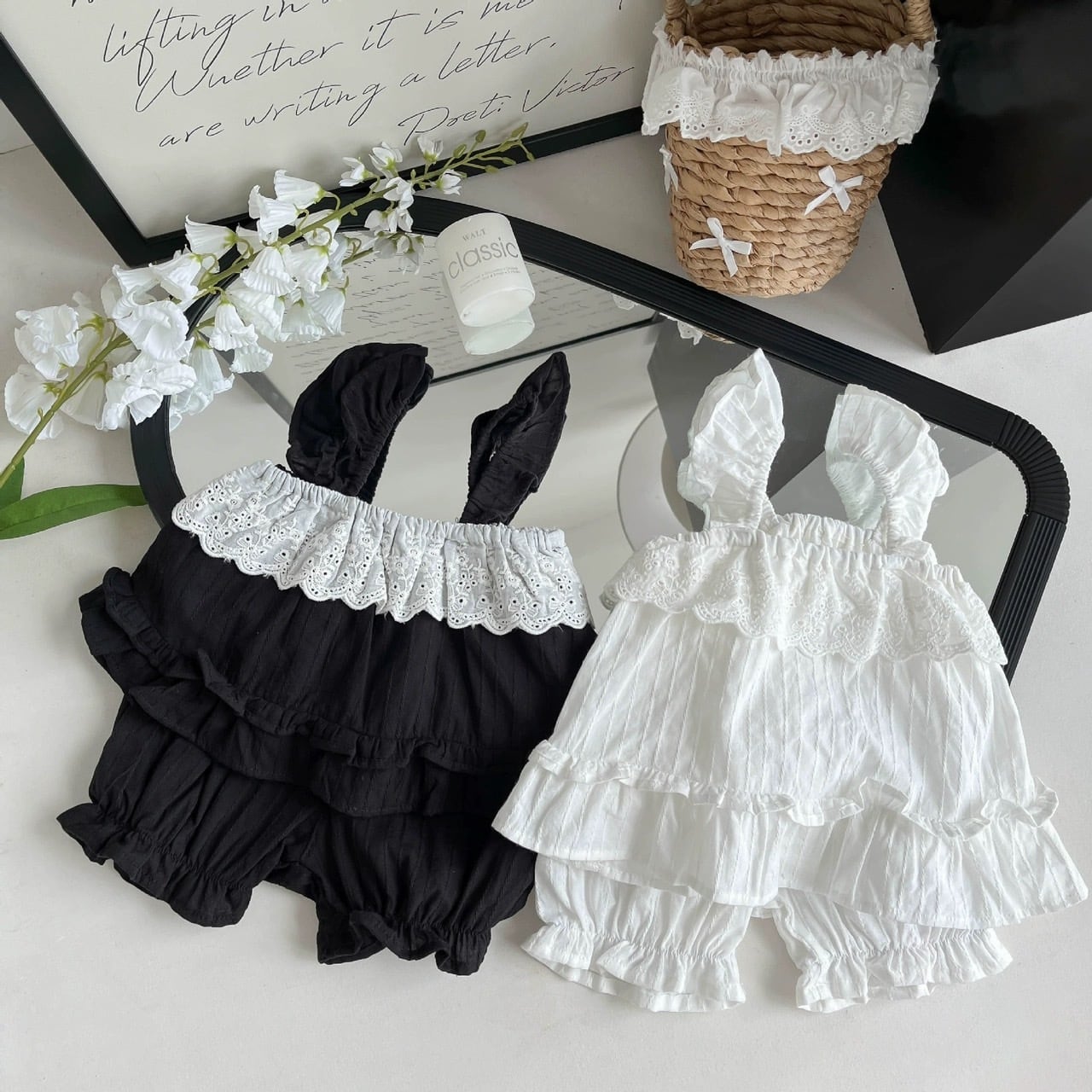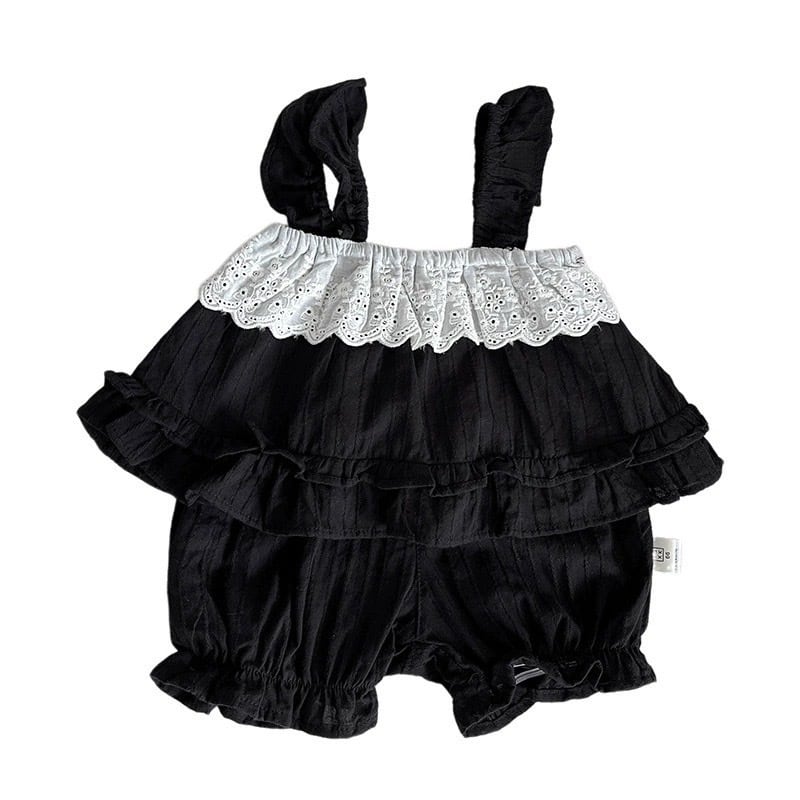 エレガントなレースとフリルが特徴のベビーセットアップです。柔らかくて軽やかな素材を使用し、赤ちゃんのデリケートな肌にも優しい着心地を提供します。黒と白の2色展開で、特別な日のお出かけや写真撮影にぴったり。シンプルながらも華やかさを演出するデザインで、赤ちゃんの可愛らしさを引き立てます。お手入れも簡単で、ママにも嬉しいアイテムです。
