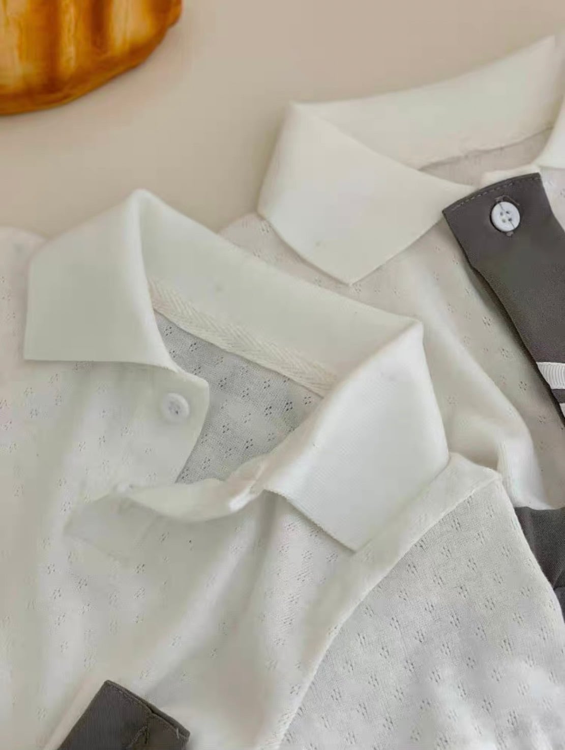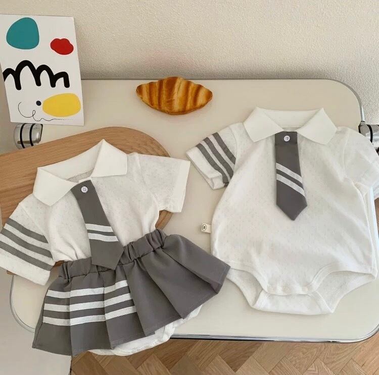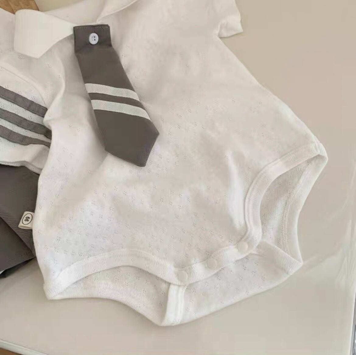 【66~90】全2種ネクタイ付きシンプルストライプロンパース