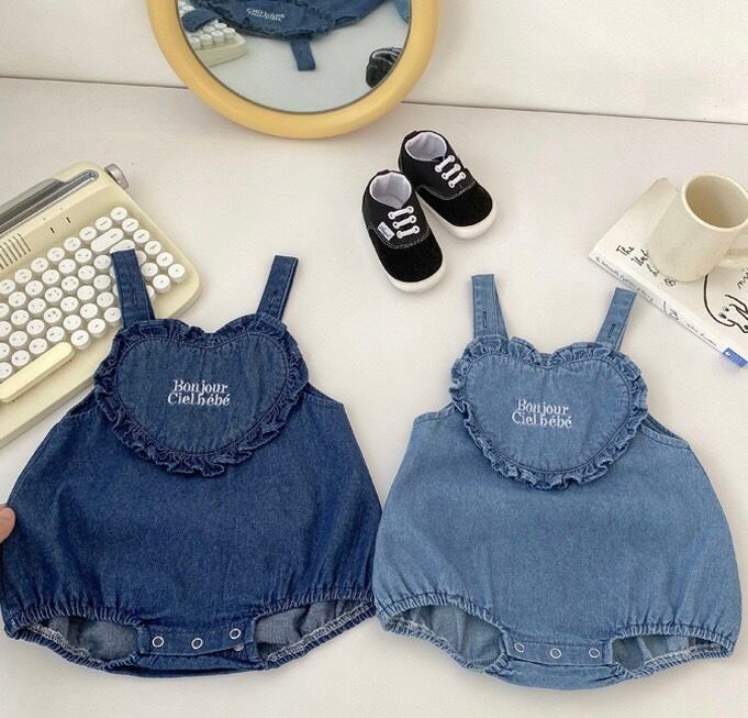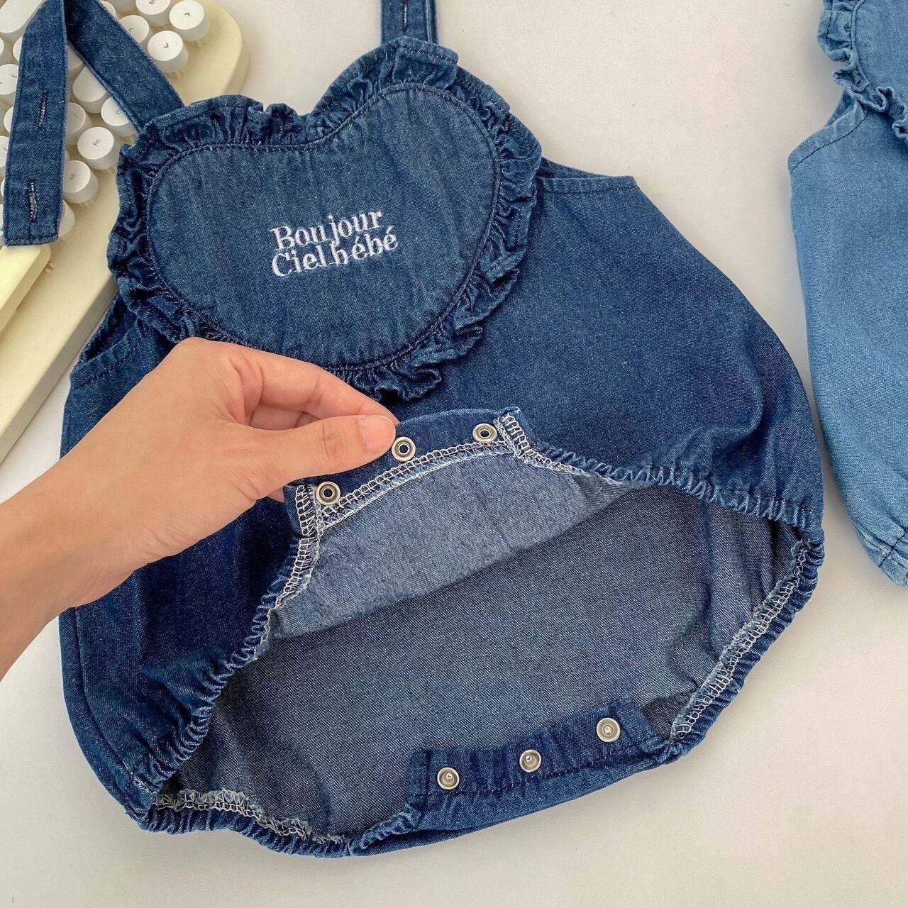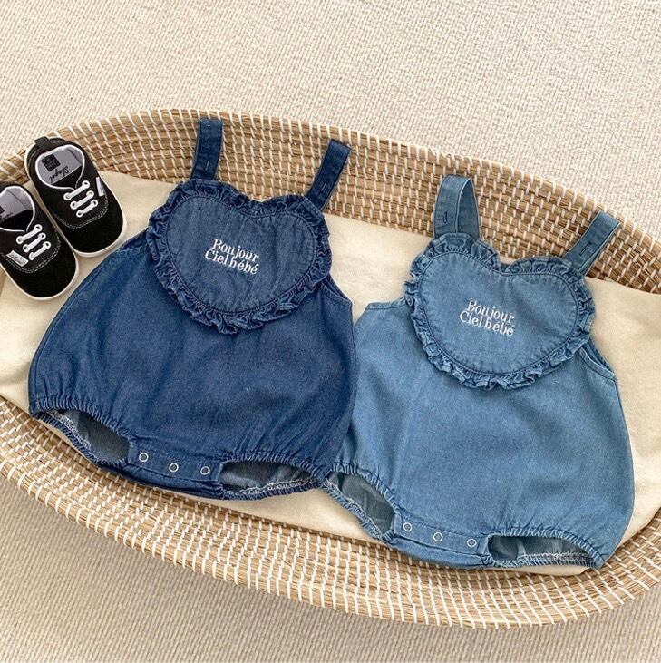 かわいらしいデニム素材のサロペットハートロンパースです。フロントには文字の刺繍が施され、ハート形のデザインがポイント。肩紐は調節可能で、お子様の成長に合わせてフィットします。裾にはスナップボタンが付いており、おむつ替えも簡単です。カジュアルなお出かけや普段使いにぴったりのアイテムです。