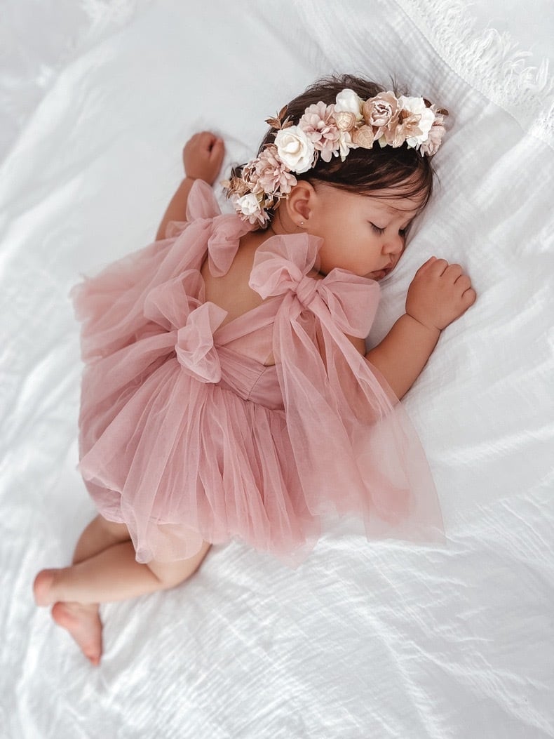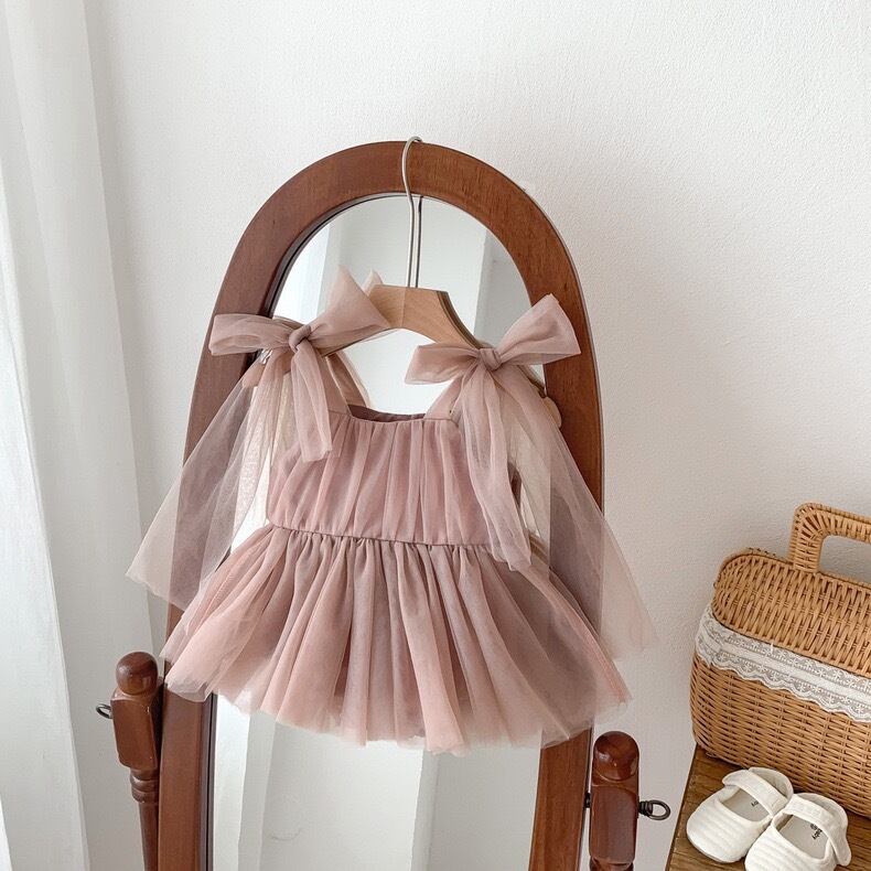 エレガントでキュートなリボンチュールドレスロンパース。柔らかな素材とふんわりとしたチュールスカートが特別な日にもぴったり。肩と背中のリボンがアクセントとなり、華やかさをプラスします。お子様の大切なイベントやフォーマルな場面におすすめです。