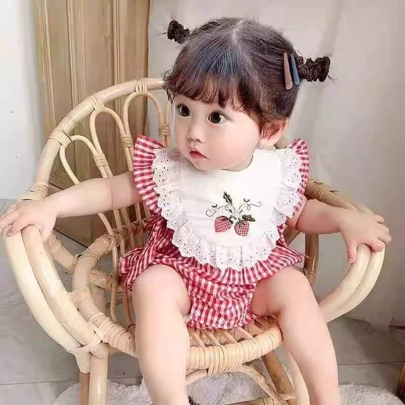 かわいらしいいちご柄とギンガムチェックが特徴のロンパース。柔らかなコットン素材で、赤ちゃんの肌に優しい作りになっています。フリルのディテールがキュートさを引き立て、どんなシーンでも可愛らしく見せてくれます。