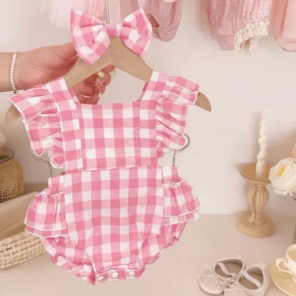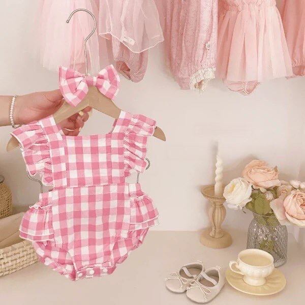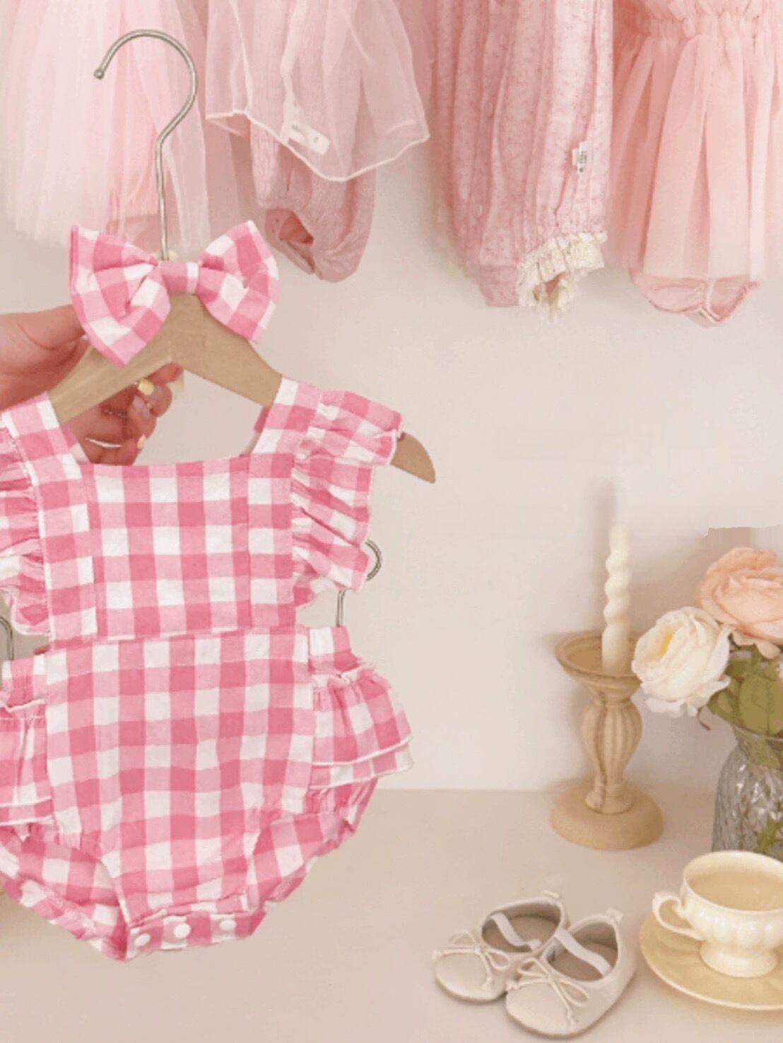 かわいらしいピンクのギンガムチェックが特徴のロンパース。フリルのディテールがキュートさを引き立て、どんなシーンでも可愛らしく見せてくれます。インナーやTシャツに合わせての着用も可能です。スナップボタン付きで着脱も簡単です。