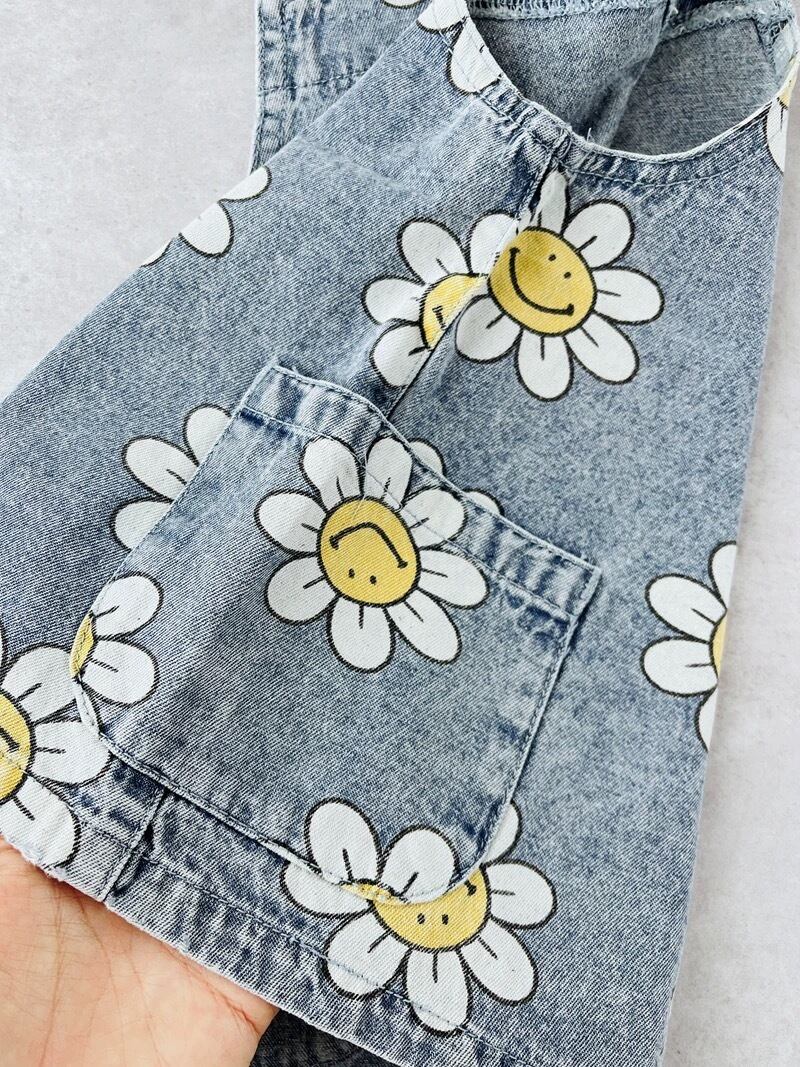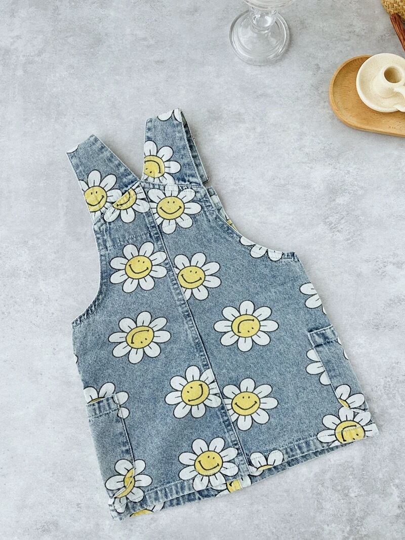 可愛らしいスマイルフラワープリントが施されたデニムスカートオーバーオールです。デニム生地のしっかりとした作りで、アクティブな日々にもぴったり。肩紐は調節可能で、成長に合わせて長くご使用いただけます。フロントには便利なポケットが2つ付き、実用性も抜群。シンプルなトップスと合わせるだけで、元気いっぱいのコーディネートが完成します。お出かけや遊び場で目を引くこと間違いなしのアイテムです。