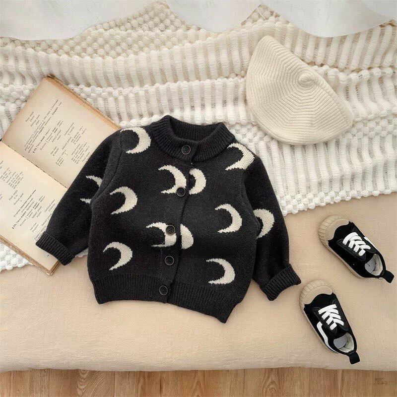 「ムーンニットカーディガン」は、月のデザインが施されたエレガントで快適なベビー用カーディガンです。フロントにボタンが付いているので、簡単に着脱が可能です。シンプルでありながらもスタイリッシュなデザインは、どんなコーディネートにも合わせやすく、お出かけや普段使いに最適です。