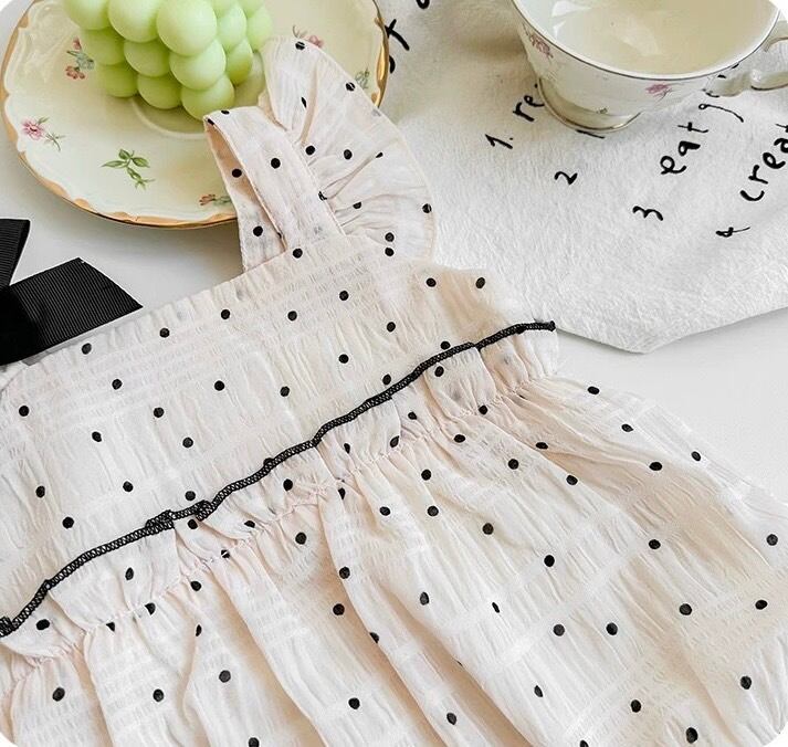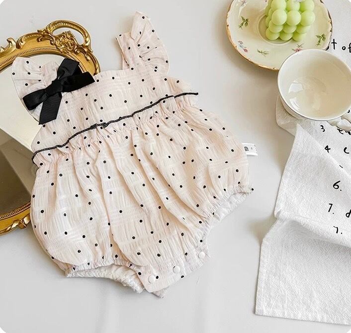 「ドットリボンフリルベビーロンパース」は、愛らしいドット柄とリボンがアクセントのベビー用ロンパースです。フリル袖がキュートなデザインを引き立て、柔らかいコットン素材で赤ちゃんの肌に優しく快適な着心地を提供します。肩部分のリボンがエレガントさをプラスし、特別な日のお出かけやフォーマルなシーンにもぴったりです。スナップボタン付きでおむつ替えも簡単にできます。