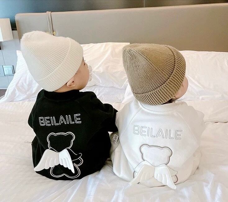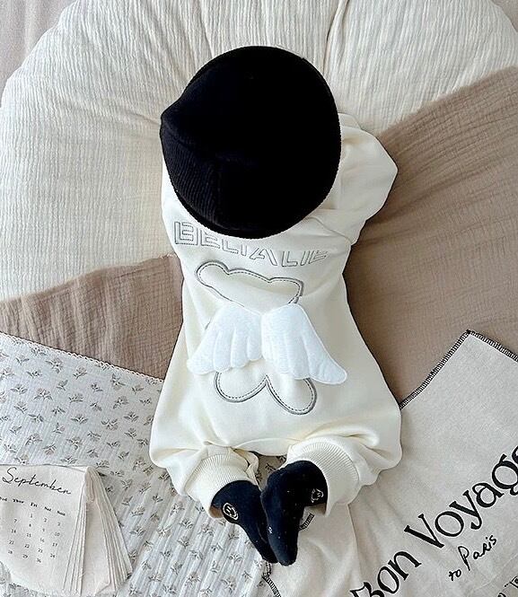 「エンジェルベアスウェットロンパース」は、柔らかなコットン素材で作られた、赤ちゃんのための快適でキュートなスウェットロンパースです。背中には、愛らしいテディベアのデザインとエンジェルウィングの刺繍が施されており、ユニークで魅力的なスタイルを演出します。肌寒い日にもぴったりな温かみのある一枚です。ベビーシャワーやギフトにも最適です。