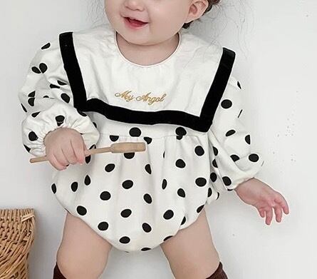「セーラー風ドットロンパース」は、赤ちゃんのためのキュートで爽やかなデザインのロンパースです。セーラーカラーとドット柄の組み合わせが特徴で、クラシックなマリンスタイルを演出します。柔らかなコットン素材で、動きやすく快適な着心地を提供します。スナップボタン付きでお着替えも簡単。おしゃれなお出かけや写真撮影にもぴったりの一枚です。
