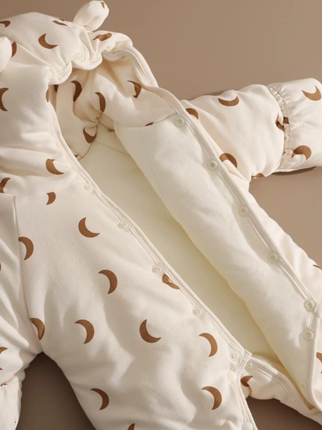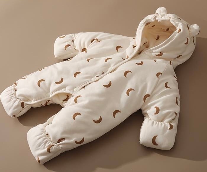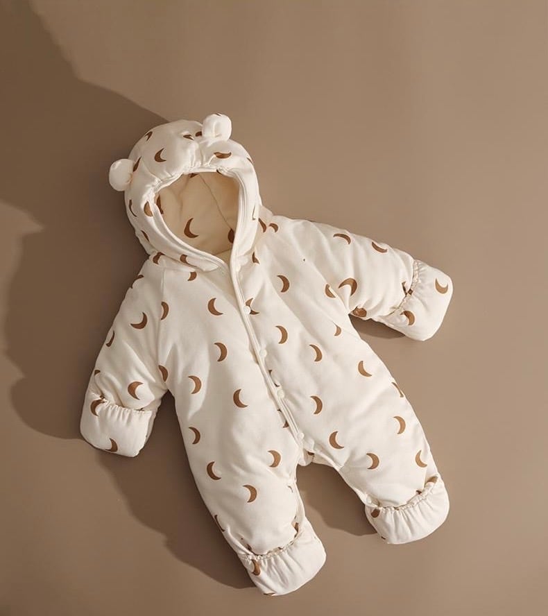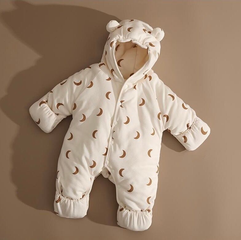 可愛らしい月柄とくま耳フードが特徴の、ふんわりあったかダウンロンパース。寒い季節でも赤ちゃんを優しく包み込み、快適に保温します。お出かけやベビーカーでの移動にも最適なデザイン。冬のおしゃれと機能性を兼ね備えた、愛らしい一着です。