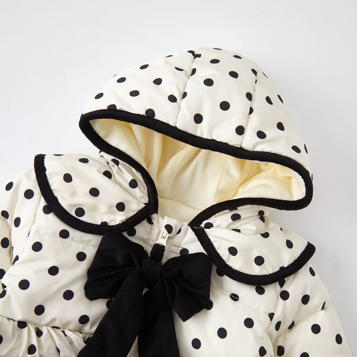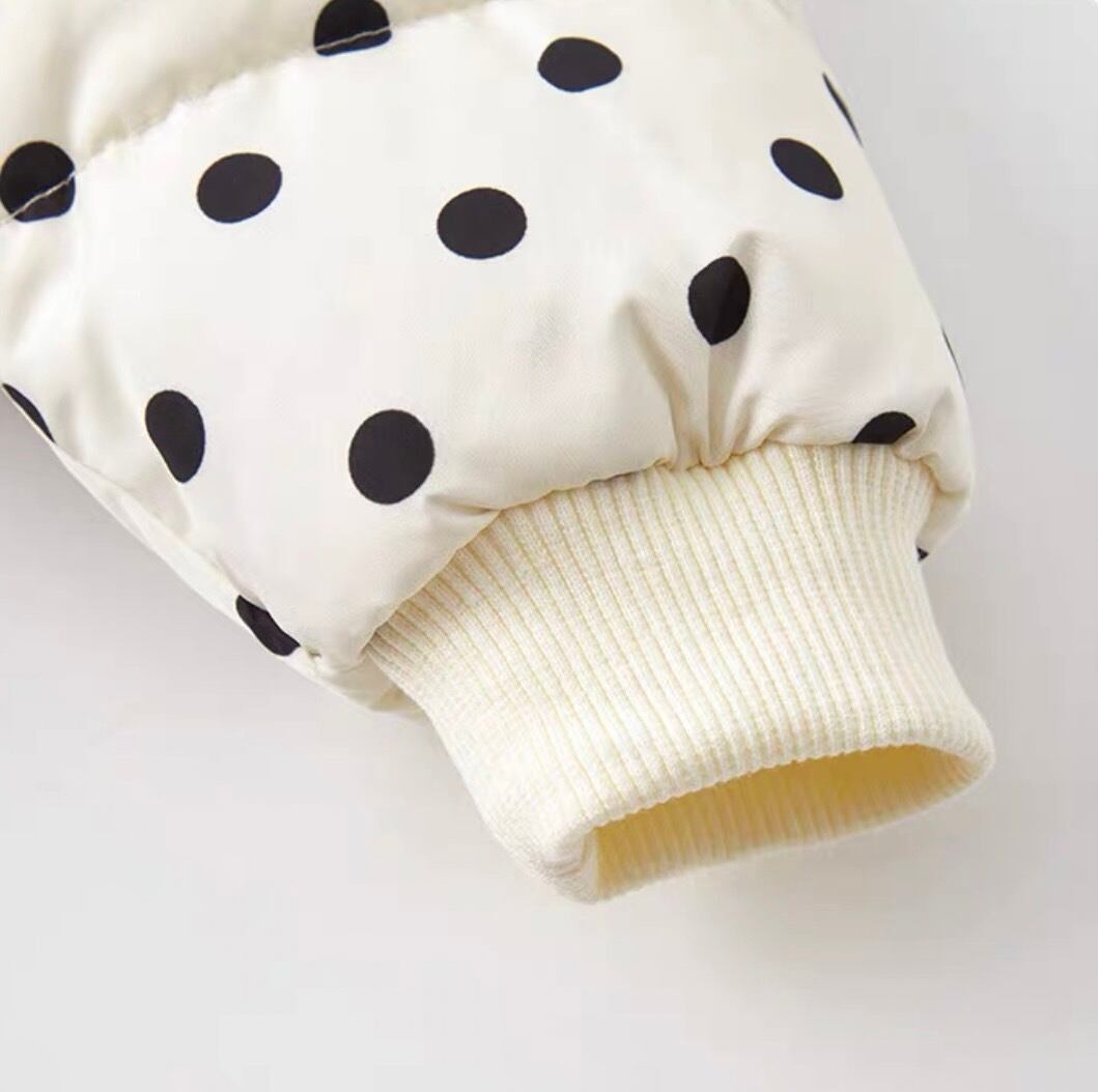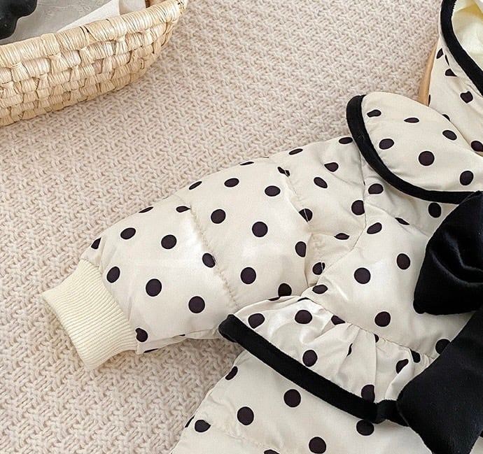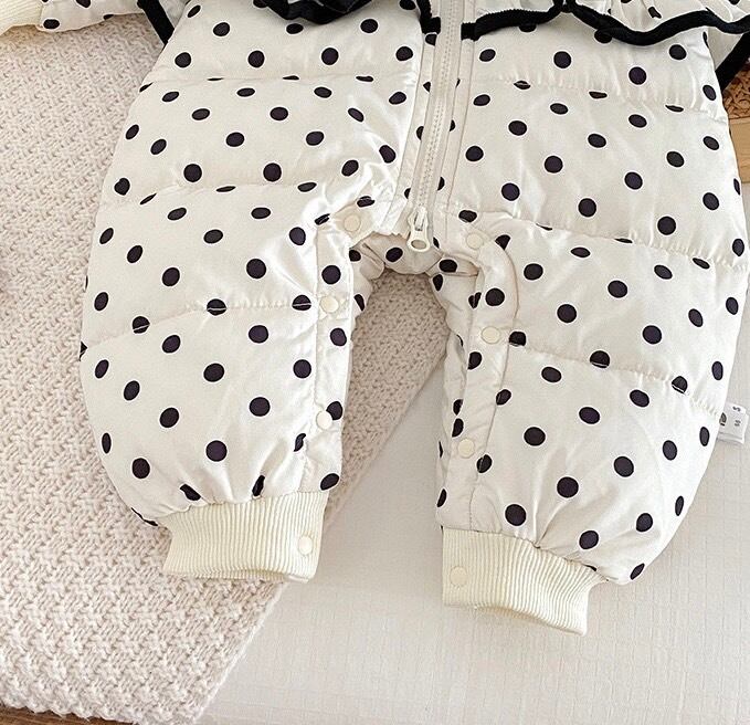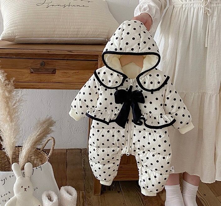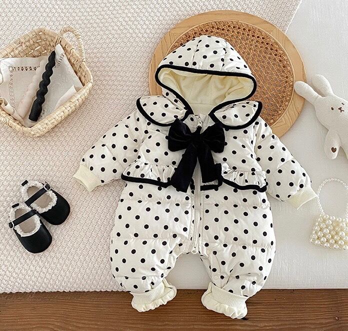 シンプルで洗練されたモノトーンカラーに、リボンとドット柄が散りばめられたエレガントなダウンロンパース。軽くて暖かい素材が、冬の寒さから赤ちゃんをしっかり守り、快適な着心地を提供します。デイリーから特別なシーンまで幅広く活躍する一着です。