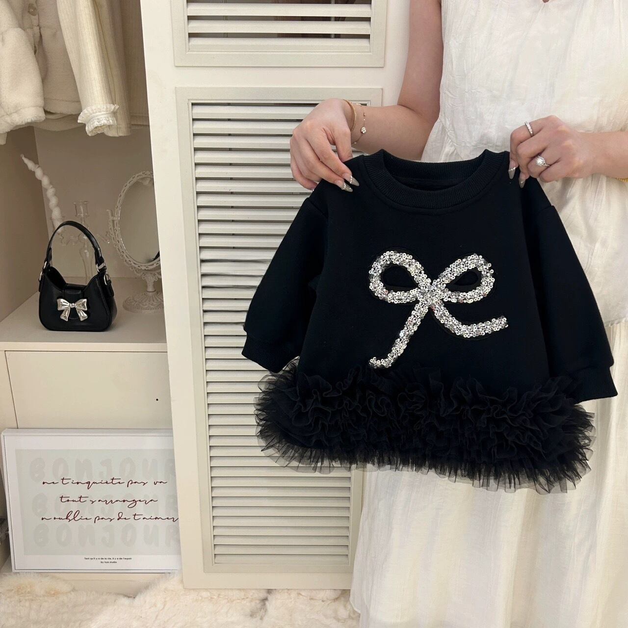 キラキラ輝くビジューとかわいいリボンがポイントのチュチュトップス。ふんわり広がるチュール素材が女の子らしさを引き立て、特別な日のおしゃれにもぴったり。ソフトな素材で着心地も抜群。普段使いからお出かけまで大活躍するアイテムです。